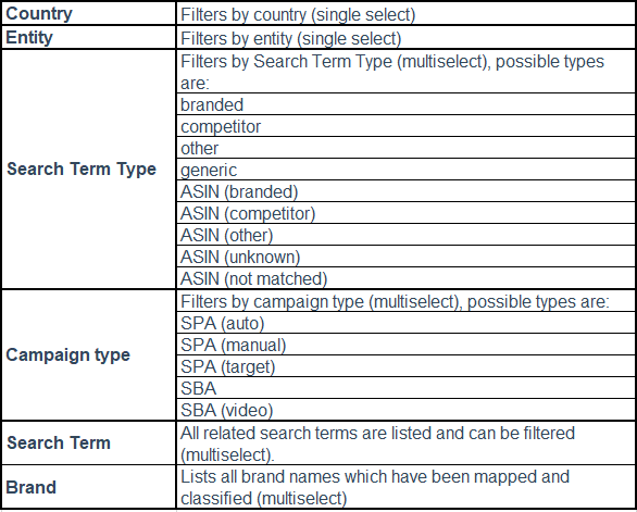 Own brands (search term type “branded”) are identified from all brand names listed on Amazon product pages for all of your advertised products, if the related campaigns have generated clicks and thereby, costs. All other brands are identified by collecting brand names from ASINs which have been targeted successfully (generated costs) by your campaigns. This list is updated every day, but it could be that relevant own or competitor brands are missing. These brand names can be added manually.