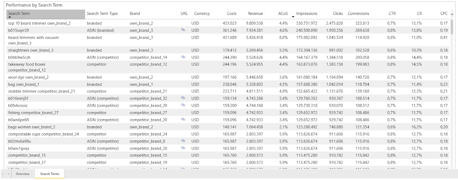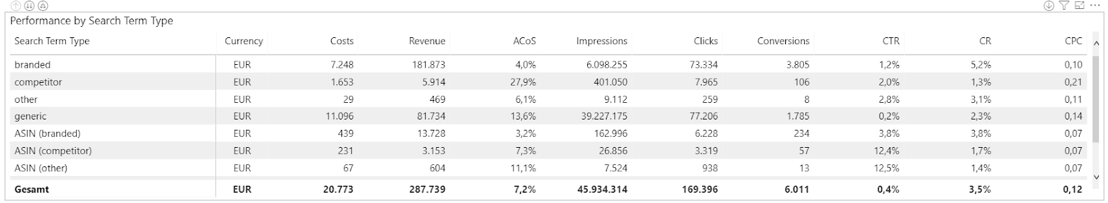 Tips & Tricks: The “Search Terms” tab in the report helps you identify missing own or competitor brand names. You can filter search term type “generic” and verify which of the listed search terms contain a brand name that should be classified as branded or competitor. Therefore, the KPIs serve as relevant indicators.