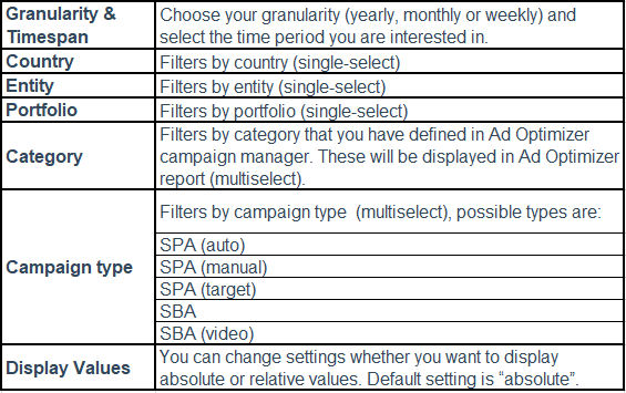 Use filters in order to analyze the Ad Optimizer KPIs for a specific part of your campaigns. The KPIs in all further sections will adjust according to the filters that have been set.