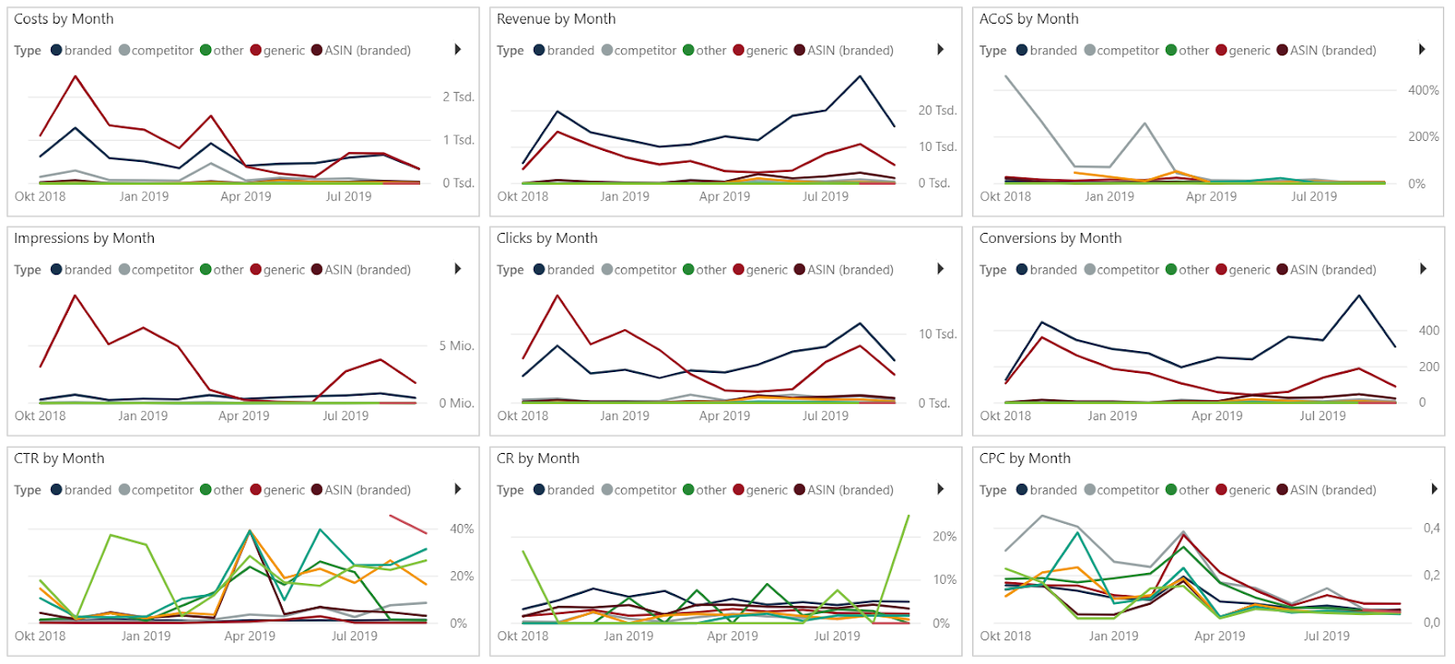 The same KPIs as in the above table are displayed in 9 history charts by Search Term Type in their development over time.